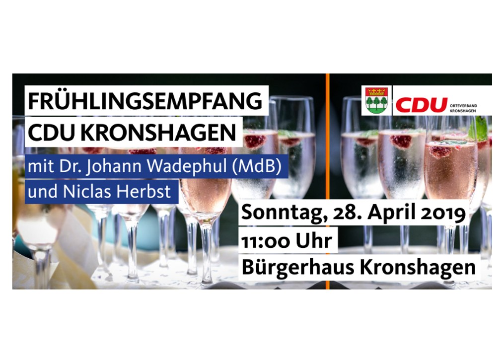 Der CDU-Ortsverband Kronshagen lädt Sie herzlich zu seinem Frühlingsempfang 2019 ein ins Bürgerhaus Kronshagen.  Als besondere Gäste erwarten wir unseren CDU-Kreisvorsitzenden und Bundestagsabgeordneten Dr. Johann-David Wadephul sowie den Spitzenkandidaten der CDU Schleswig-Holstein zur Europawahl am 26. Mai 2019, Niclas Herbst.