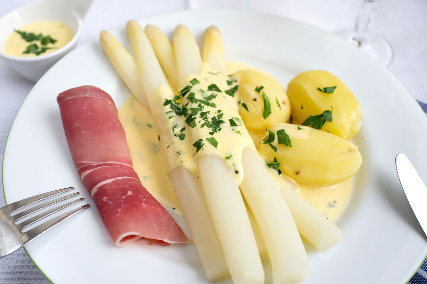 dazu neue Kartoffeln, Sauce Hollandaise und zerlassene Butter